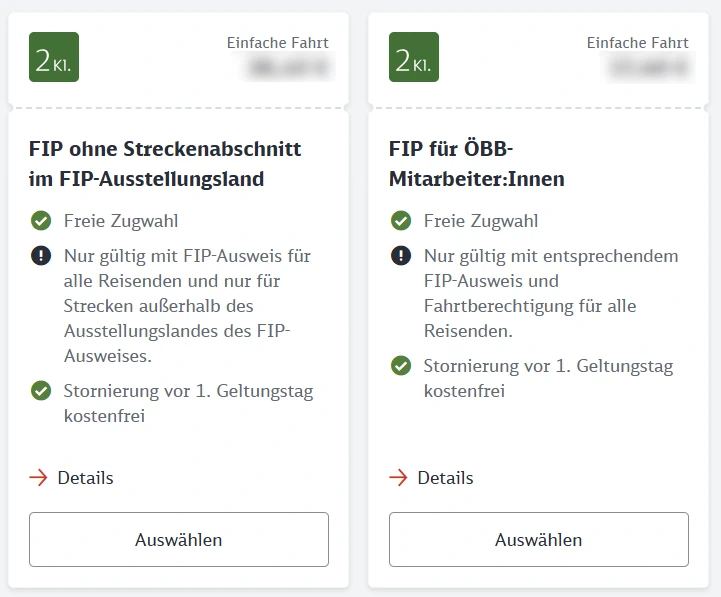 FIP Coupons and FIP 50 Tickets are valid on ÖBB services. For cross-border journeys, either a through FIP 50 Ticket or FIP Coupons for both countries are required.
