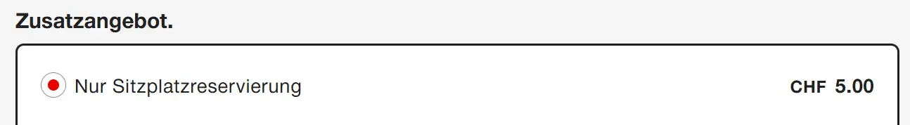 Individual national reservations can be purchased online at SBB. To do so, search for the connection using the regular journey planner. Then select the desired connection (“Choose ticket”) and you can then select the additional option “Seat reservation only”.