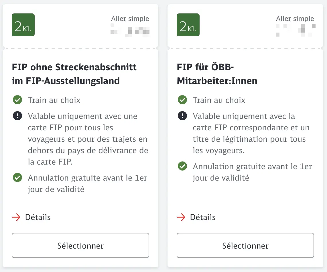 Les employés de la Deutsche Bahn peuvent acheter en ligne des Billets FIP 50 pour des trajets au départ de l’Allemagne vers les pays voisins. Ces billets sont disponibles via le portail DB Reisemarkt > Bahnangebote > Ausland > FIP-Angebot. Le Billet FIP 50 est uniquement valable pour la partie étrangère du trajet. C’est un point important pour les employés DB, car les Billets FIP 50 ne sont pas valables dans leur propre pays. Un billet supplémentaire est donc nécessaire pour le trajet intérieur jusqu’au point frontalier.