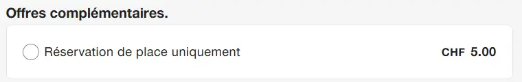Des réservations individuelles pour des trajets nationaux peuvent être achetées en ligne sur le site des CFF. Pour cela, effectuez une recherche via le planificateur de voyage classique. Sélectionnez ensuite la connexion souhaitée (« Choisir le billet »), puis l’option « Réservation de siège uniquement ».